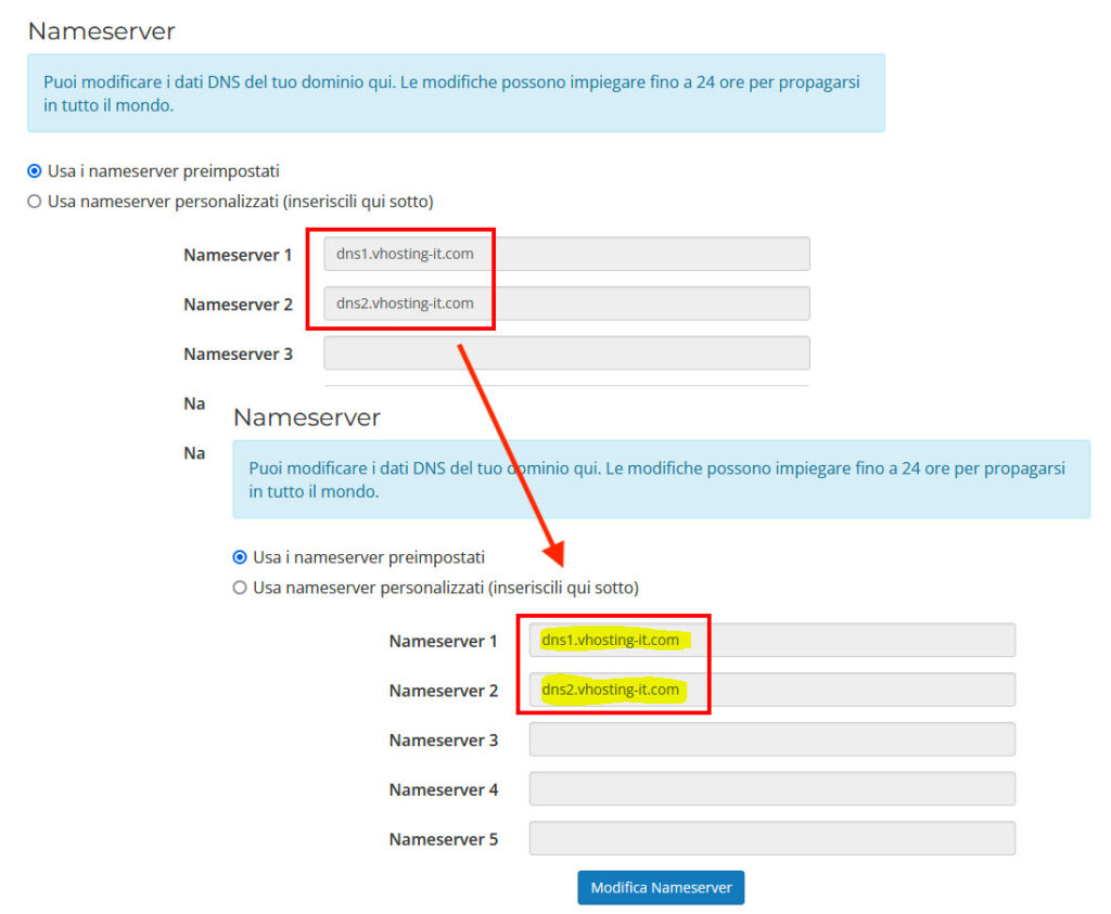 Inserire i Nameserver con servizio hosting attivo